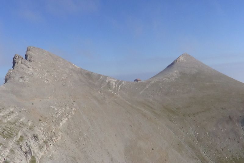 Το θέαμα που θα αντικρύσετε μετά από μερικά λεπτά, με το που θα έχετε δηλαδή για πρώτη φορά οπτική επαφή με το "Οροπέδιο των Μουσών" θα σας μείνει αξέχαστο. Από τα πιο όμορφα μέρη της χώρας μας και σε υψόμετρο κοντά στα 2.600 μ. Αριστερά είναι η κορυφή "Τούμπα" με υψόμετρο 2.787 μ. στη μέση το καταφύγιο Γιώσος Αποστολίδης και δεξιά η κορυφή Προφήτης Ηλίας με υψόμετρο 2.803 μ. (Εικόνα 7)...