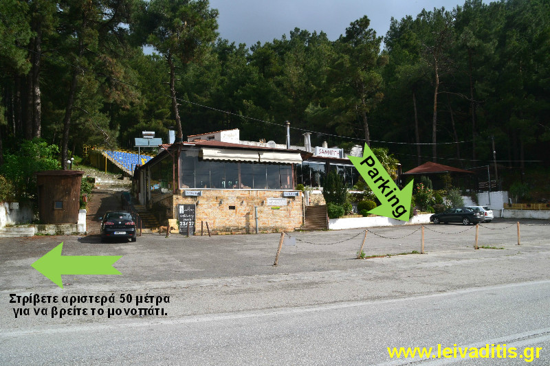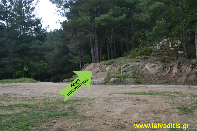 Ξεκινάτε από το parking της καφετέριας Ξανθίππη, υψόμετρο 160 μέτρα (Εικόνα 1) και αφού αφήσετε το αυτοκίνητό σας περπατάτε προς την πόλη για περίπου 50 μέτρα μέχρι που να συναντήσετε μια άσπρη βρύση και να δείτε τα πρώτα σημάδια της διαδρομής δεξιά μέσα στο δάσος (ταμπελάκια πάνω σε δέντρα) τα οποία σας υποδυκνείουν την διαδρομή μέχρι το γήπεδο - αλάνα από όπου ξεκινάει το κλασικό μονοπάτι για την ανάβαση στην κορυφή Στ. Τσακίρης.
