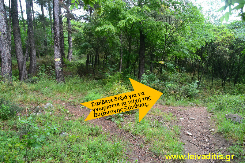 Αφού περπατήσετε 550 μέτρα (10 λεπτά περίπου) και σε υψόμετρο 240 μέτρων θα δείτε διασταύρωση και ταμπελάκια που σας υποδυκνείουν να προτιμήσετε ή την αριστερή ή την δεξιά διαδρομή (Εικόνα 2). Και οι δυο θα σας οδηγήσουν στον ίδιο σημείο (στο γήπεδο που λέγαμε νωρίτερα), απλά αν πάτε αριστερά βγαίνετε κατευθείαν εκεί ενώ αν στρίψετε δεξιά θα περάσετε από τα τείχη της Βυζαντινής Ξάνθειας και θα ομορφήνετε ακόμη πιο πολύ την ήδη ωραία διαδρομή που αποφασίσατε να περπατήσετε.
