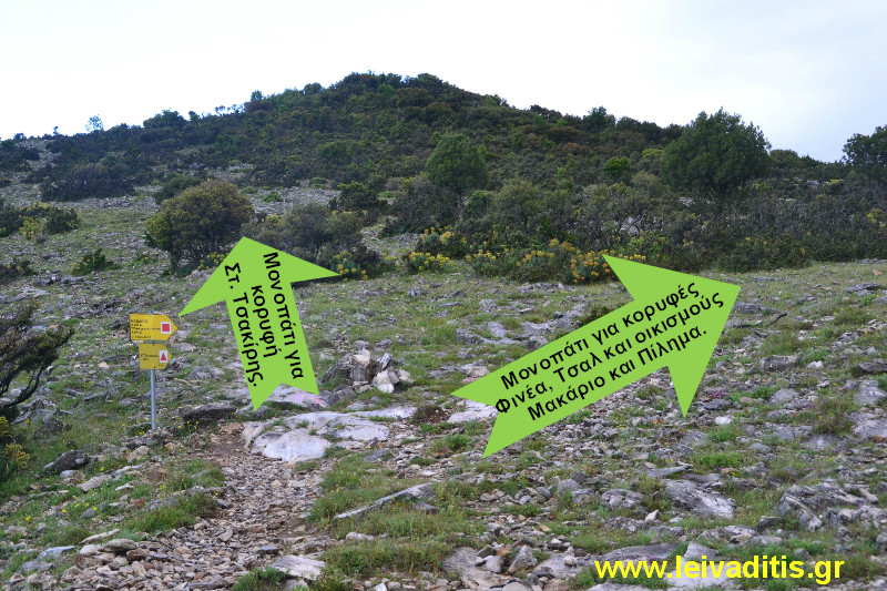 Συνεχίζετε το περπάτημα για άλλα 350 μέτρα πάνω στο κλασικό μονοπάτι οπότε φτάνετε στην μέση του περίπου, μετά από 8 λεπτά και σε υψόμετρο 465 μέτρων. Εκεί θα διαπιστώσετε ότι υπάρχει διασταύρωση (Εικόνα 6)και οι ταμπελίτσες που υπάρχουν σας ενημερώνουν ότι αν συνεχίσετε ευθεία (αριστερά δηλαδή) φεύγετε για την κορυφή Στ. Τσακίρης ενώ αν στρίψετε δεξιά ακολουθείτε την διαδρομή για Μακάριο και Τσαλ. Όπως καταλάβατε ενημέρωση για την κορυφή Φινέας δεν υπάρχει, να γνωρίζετε όμως ότι είστε στον σωστό δρόμο.
