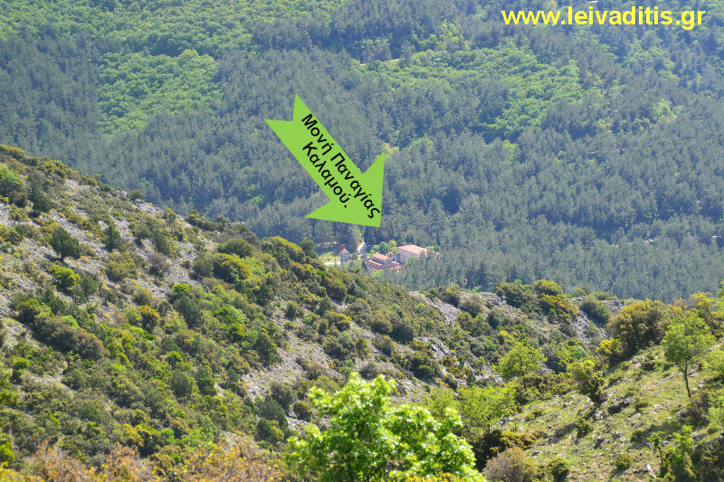 Από τη διασταύρωση και μετά περπατάτε άλλο 1 χιλιόμετρο, σε περίπου 20 λεπτά και σε υψόμετρο 585 μέτρων το μονοπάτι κάνει μια στροφή αριστερή (κάτι σαν "μύτη" σκεφτείτε το) και αρχίζουν να φαίνονται από την απέναντι πλαγιά τα χωριά και το μοναστήρι της Παναγίας της Καλαμού (Εικόνα 7).