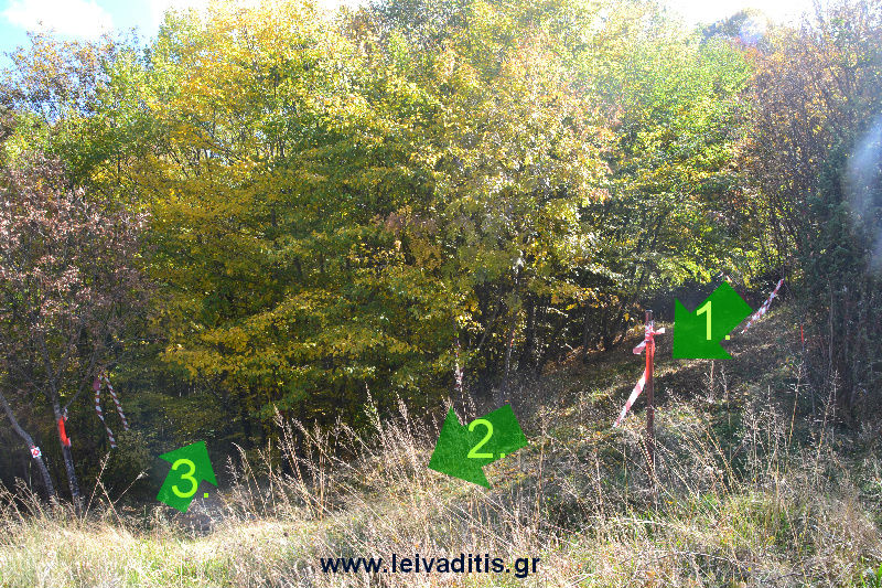Στη συνέχεια ακολουθείτε τα σημάδια και τα κόκκινα πανάκια που υπάρχουν σε πέτρες και δέντρα για άλλα 340 μέτρα περίπου(1.860μ. από την αρχή) ή δέκα λεπτά πορείας μέχρις ότου συναντήσετε ένα ξέφωτο και στο δεξί σας χέρι ένα σιδερένιο στύλο με κόκκινο πανί, σε υψόμετρο 1.010 μέτρων.