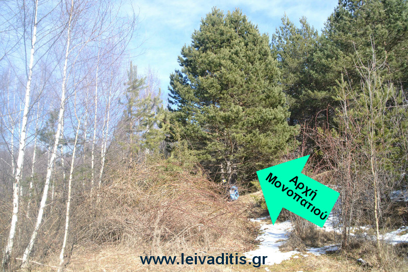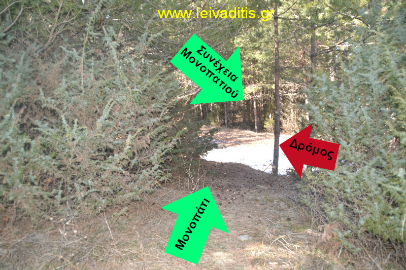 Ξεκινάτε λοιπόν το περπάτημα και στα 10 πρώτα λεπτά που έχετε ήδη διανύσει τα πρώτα 585 μέτρα του μονοπατιού, θα δείτε ότι συναντιέται με αγροτικό δρόμο (σε υψόμετρο 1.210 μέτρων). Τον διασχίζετε κάθετα και ακριβώς απέναντι μια κίτρινη ταμπελίτσα, σας υποδυκνύει από πού συνεχίζει το μονοπάτι.