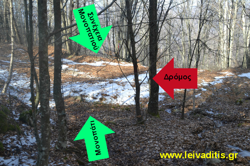 Στο βάθος δεξιά της αλάνας θα συναντήσετε δέντρο με κόκκινο πανάκι και ασπροκόκκινο σημάδι. Το μονοπάτι μήκους 3 χιλιομέτρων και 410 μέτρων και χρονικής διάρκειας 1 ώρας και 20 λεπτών με πολύ χαλαρό περπάτημα, είναι πολύ καλά σηματοδοτημένο. Πρέπει να ακολουθήσετε όμως τα συγκεκριμένα ασπροκόκκινα σημάδια ή κόκκινα πανάκια, για να μη χαθείτε (μην ακολουθείτε τα πορτοκαλί σημάδια ή τα κόκκινα φωσφορούχα χαρτονάκια πάνω στα δέντρα γιατί θα οδηγηθείτε στο Τραχώνι Δράμας).
