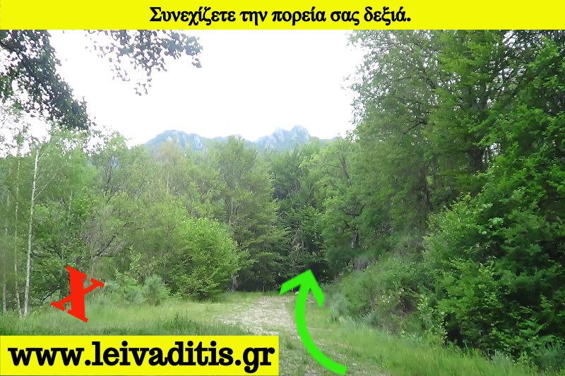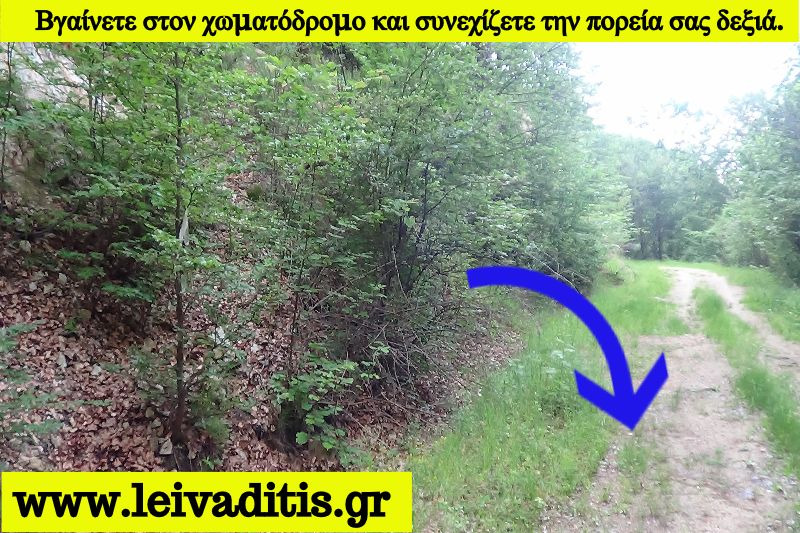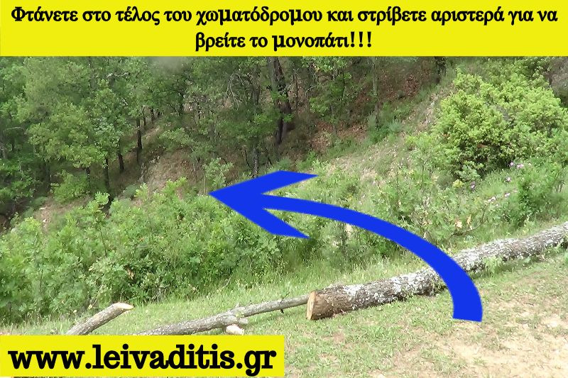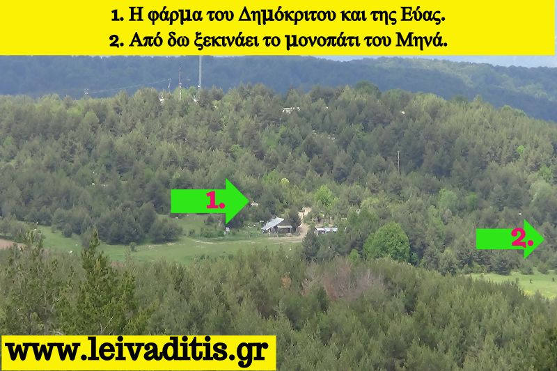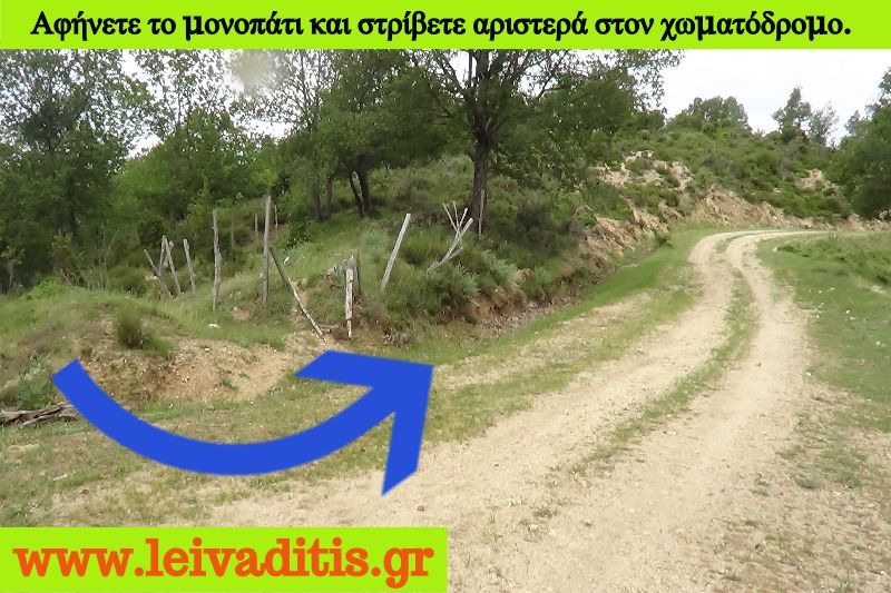Αφού περάσετε λοιπόν και την φάρμα προχωράτε άλλα 350 μέτρα πάνω στον χωματόδρομο και μετά το περιφραγμένο χωράφι που θα δείτε στην αριστερή μεριά του δρόμου μπαίνετε στο μονοπάτι του Μηνά την τελευταία πράξη του σημερινού "δράματος". Το μονοπάτι έχει συνολικό ανάπτυγμα 2,2 χιλιόμετρα και μετά από 55 λεπτά σας οδηγεί μέσα στον ορεινό οικισμό του Λειβαδίτη σε υψόμετρο 1.240 μέτρων (Εικόνα 22)...