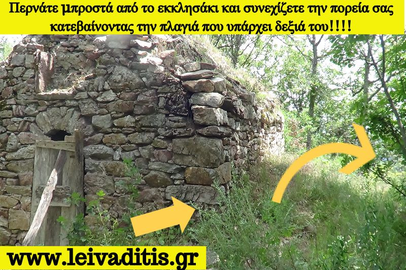 Πίσω από την εκκλησία ξεκινάει χωματόδρομος τον οποίο και ακολουθείτε για 950 περίπου μέτρα, θα χρειαστεί να περπατήσετε 18 λεπτά οπότε και φτάνετε σε διασταύρωση με άλλους 2 χωματόδρομους σε υψόμετρο 490 μέτρων. Δεν ακολουθείτε κανέναν από τους χωματόδρομους αλλά ανεβαίνετε στην πλαγιά που υπάρχει ακριβώς απέναντί σας (Εικόνα 2)...