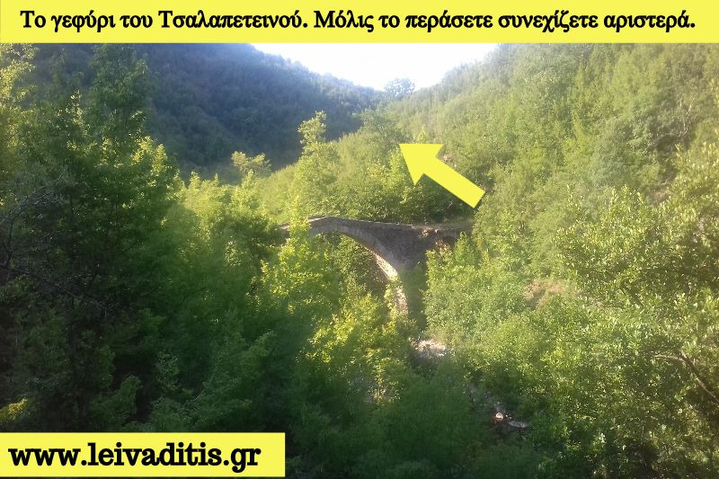 Είναι λίγο ανατριχιαστικό διότι καθώς περπατάς είσαι στις σκέψεις σου και αναρωτιέσαι που ήρθες...αμφισβητείς ακόμη και αν ήρθες από τη σωστή διαδρομή και εκεί που είσαι σκεπτικός ξαφνικά το αντικρίζεις και τα ξεχνάς όλα. Από τον Τσαλαπετεινό μέχρι το γεφύρι χρειάζεται να περπατήσετε άλλα 4,1 χιλιόμετρα σε 1 ώρα και 30 λεπτά και βρίσκεστε σε υψόμετρο 165 μέτρων. Μόλις περάσετε το γεφύρι στρίβετε αριστερά και από εκεί αρχίζει η μεγαλύτερη ανηφόρα της σημερινής διαδρομής. Για τα επόμενα 3,7 χιλιόμετρα η πορεία είναι ανηφορική και θα σας οδηγήσει στο μεγαλύτερο υψόμετρο των 566 μέτρων και από εκεί και μετά, μετά από άλλο 1,2 χιλιόμετρο φτάνετε στην δεύτερη πηγή της σημερινής διαδρομής (Εικόνα 7)...