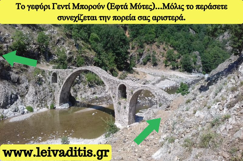 Από τον Τσαλαπετεινό υπάρχει χωματόδρομος τον οποίο ακολουθείτε για περίπου 100 μέτρα τόσα όσα χρειάζεται για να περάσετε από το τεχνικό που υπάρχει για να συγκρατεί τα νερά. Αμέσως μετά το τεχνικό συνεχίζεται αριστερά όπου και βρίσκεται το μονοπάτι που θα σας οδηγήσει στο γεφύρι "Γεντί Μπορούν" που στην γλώσσα των Πομάκων σημαίνει "Εφτά Μύτες". Σε κάποιο σημείο θα πρέπει να προσέξετε διότι το μονοπάτι χάνεται, σας πάει παραποτάμια ενώ θα πρέπει συνεχίζει δεξιά σας επάνω στα χωράφια. Για να ανέβετε θα πρέπει να προσέξετε διότι υπάρχει μια απότομη μικρή πλαγιά που ίσως σας δυσκολέψει λίγο. Λίγο πριν φτάσετε όμως στο γεφύρι έχετε και την πρώτη οπτική επαφή με τα βράχια των Θρακικών Μετεώρων (Εικόνα 5)...