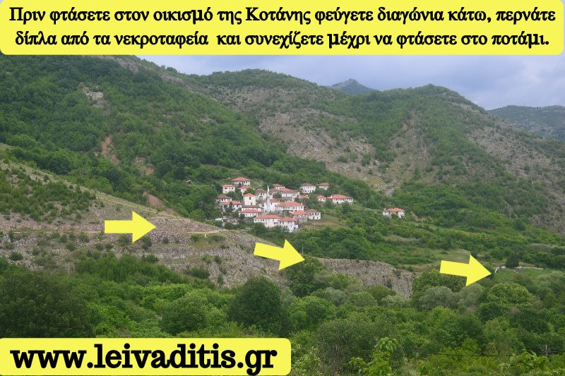Πριν φτάσετε στα πρώτα σπίτια του χωριού και αφού περπατήσετε 900 μέτρα πάνω στον αγροτικό στρίβετε λοξώς δεξιά, περνάτε τα νεκροταφεία του χωριού και ακολουθώντας το μονοπατάκι στο οποίο ήδη βρίσκεστε καταλήγετε στο ποτάμι το οποίο θα πρέπει να βρείτε τρόπο να περάσετε (Εικόνα 2)...