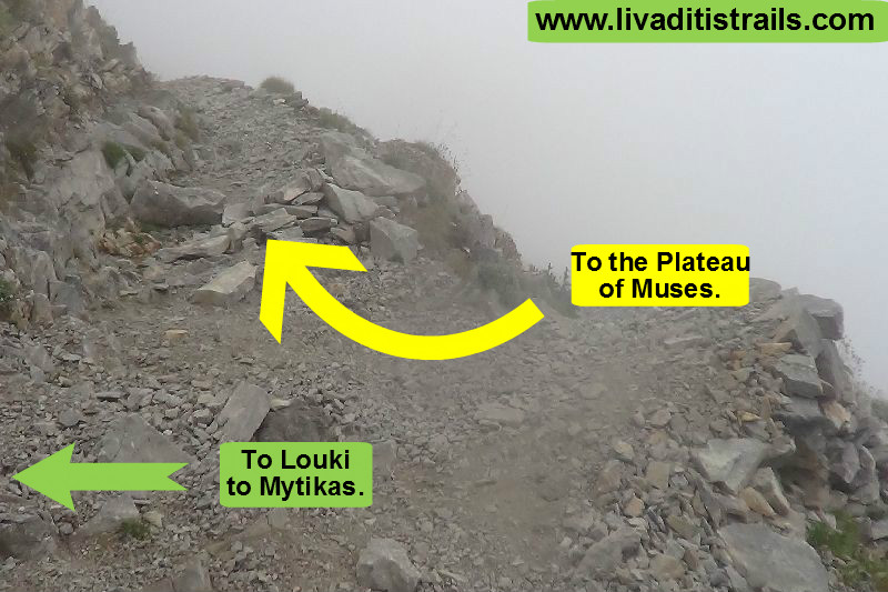 Walk for about 45 minutes at “Zonaria”, having completed 1 km and 750 meters to reach the Louki of Mytikas at an altitude of 2.700 m (Image 7)…250 meters earlier, you have passed from the “Louki” which leads to “Kakoskala”, at an altitude of 2.650 m. When you arrive at the Louki of Mytikas, continue right (on the path) to reach after a few minutes the “Plateau of Muses”.