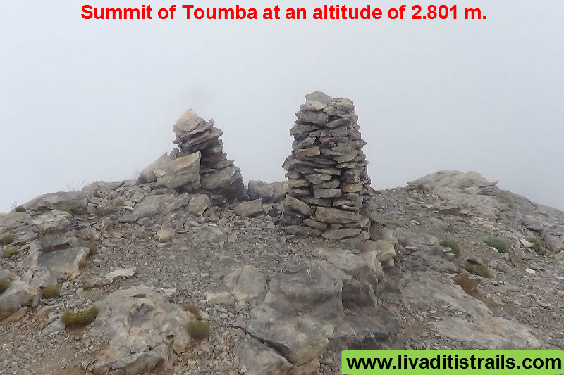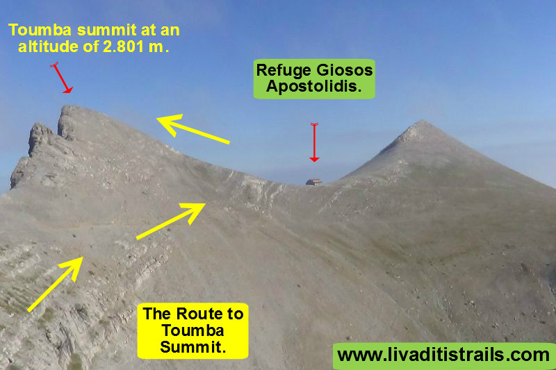 After crossing the Louki of Mytikas and come across for the first time the “Plateau of Muses”, walk for 1 km in about 20 minutes, passing right below the “Stefani of Zeus” to end up right next to the Giosos Apostolidis refuge on the left. Don’t get close; go up the hill in front of you (500 meters) and after 20 minutes you will reach the “Toumpa” summit at an altitude of 2.801 m (Image 9)…